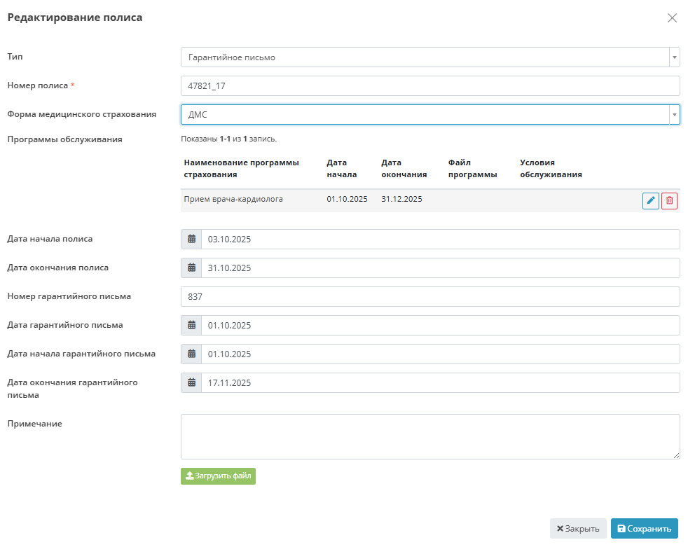 - Учет полисов ДМС — ведение базы действующих страховых документов