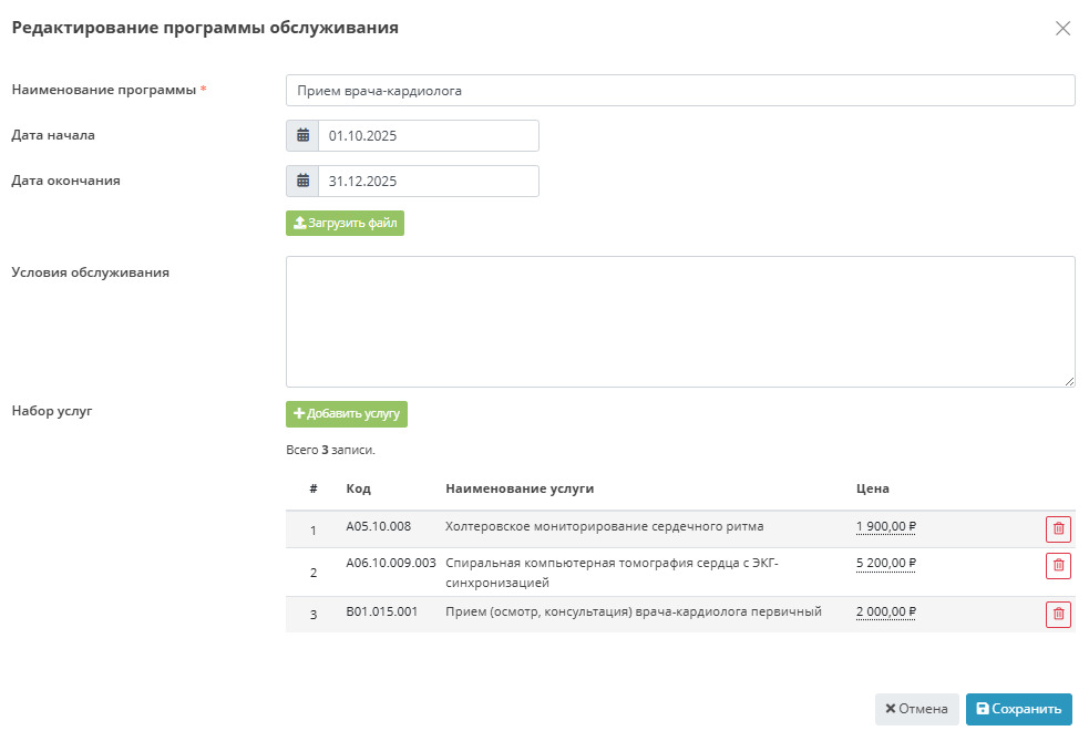- Привязка к программам обслуживания — автоматическое определение условий договора