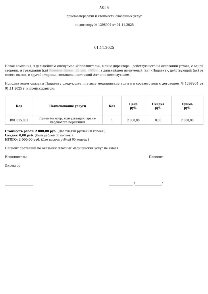 - Автозаполнение данных — из карты пациента и финансовой системы