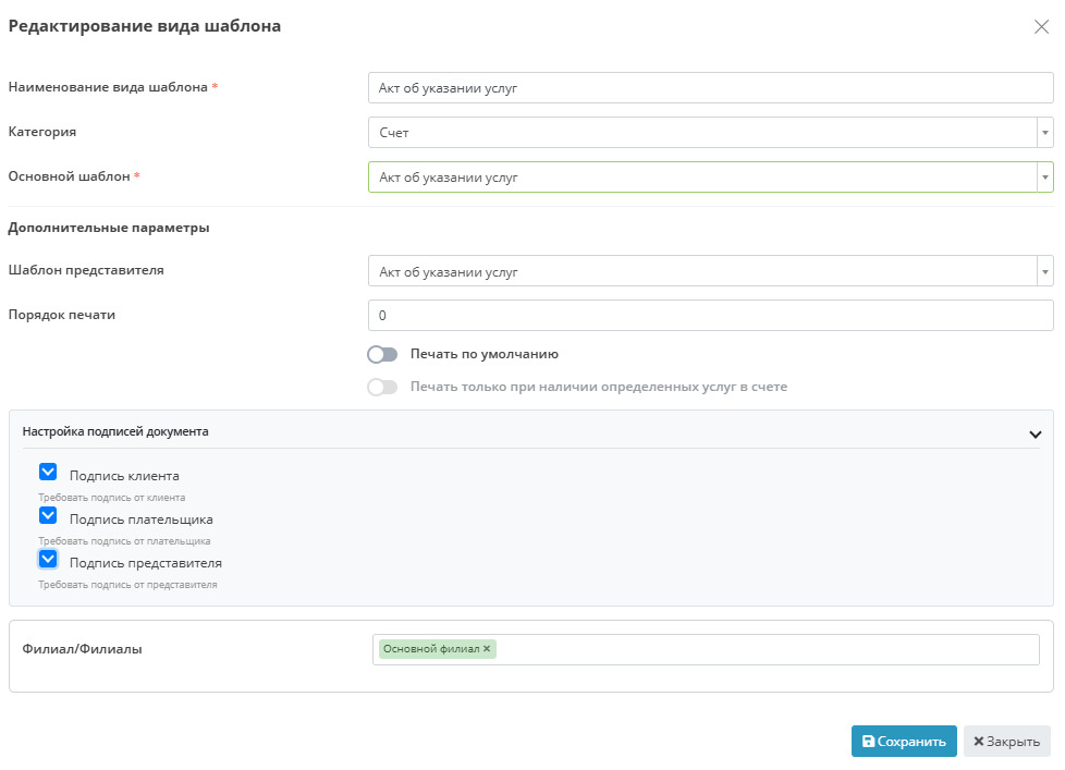 - Автопечать счетов и актов — при подтверждении оказания услуг