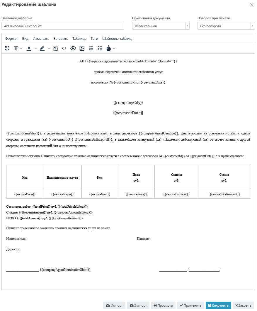 - Использование тегов внутри документа — автоматическая вставка данных пациента, врача, услуг