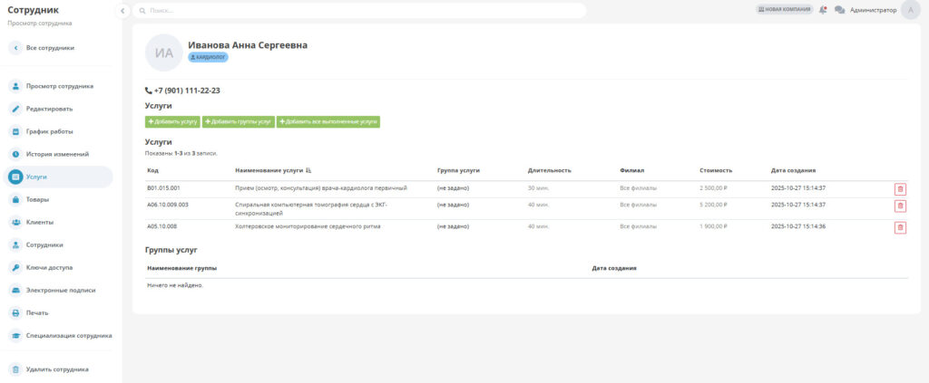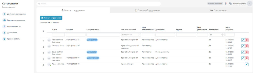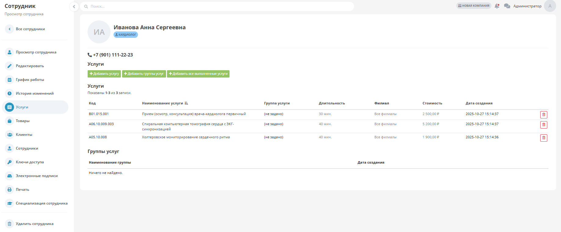 Модуль «Сотрудники» — это больше, чем база данных персонала. Это стратегический инструмент управления человеческим капиталом, который обеспечивает оптимальное использование профессиональных компетенций, создает прозрачную систему работы специалистов и способствует повышению качества медицинских услуг через эффективное управление персоналом.