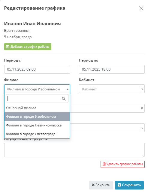 - Контроль пересечения графиков — предотвращение конфликтов при работе врачей в разных филиалах