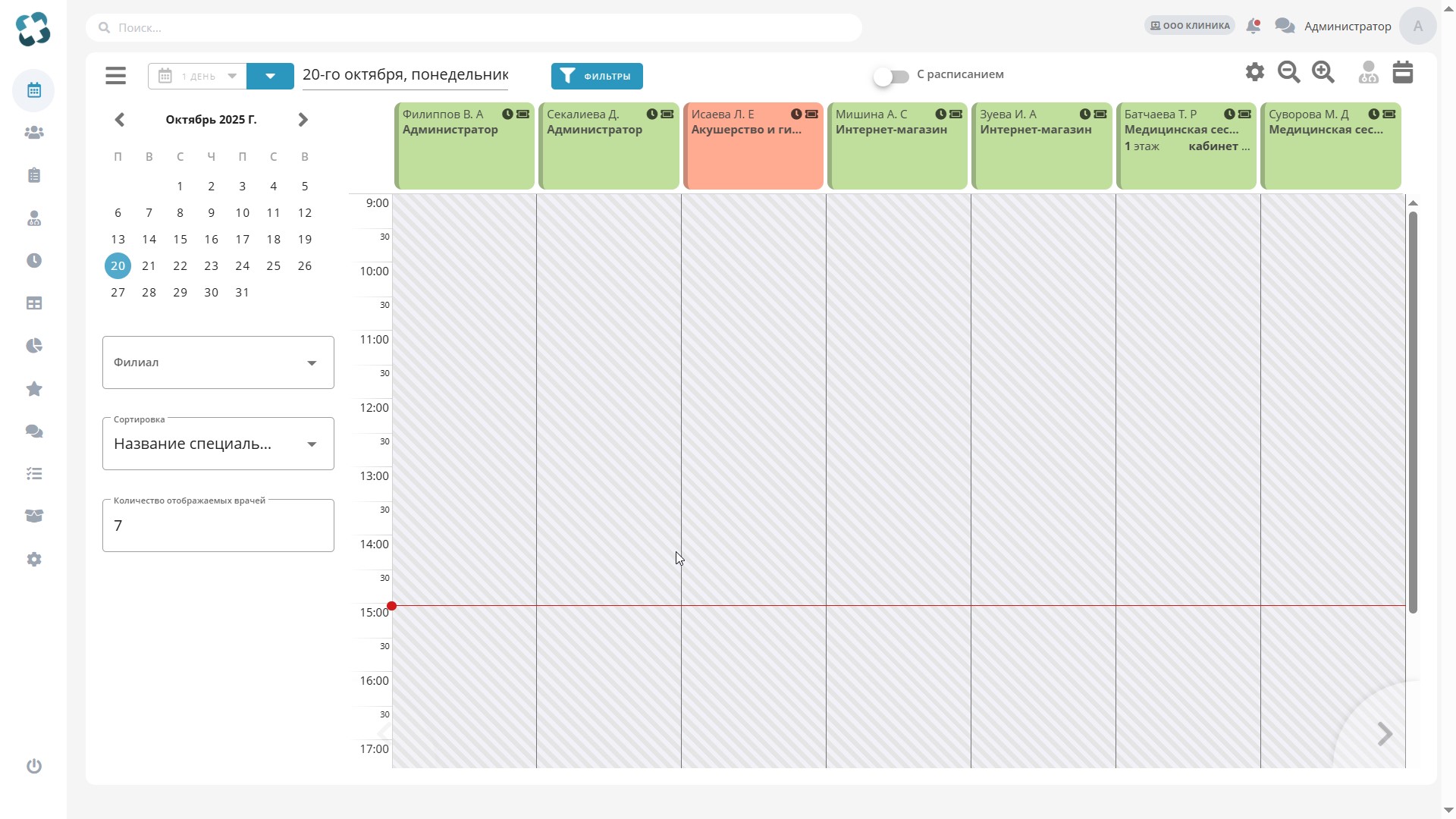 - Оптимальная загрузка. Визуальное планирование с цветовой индикацией (прием, окно, отгул) позволяет равномерно распределить нагрузку и избежать как «простоев», так и перегрузки врачей.