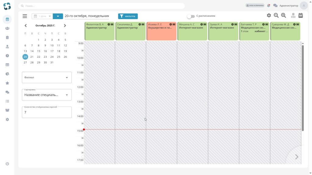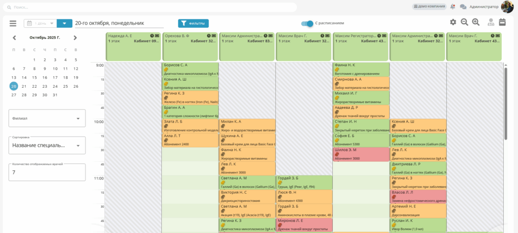 - Оптимальная загрузка. Визуальное планирование с цветовой индикацией (прием, окно, отгул) позволяет равномерно распределить нагрузку и избежать как «простоев», так и перегрузки врачей.