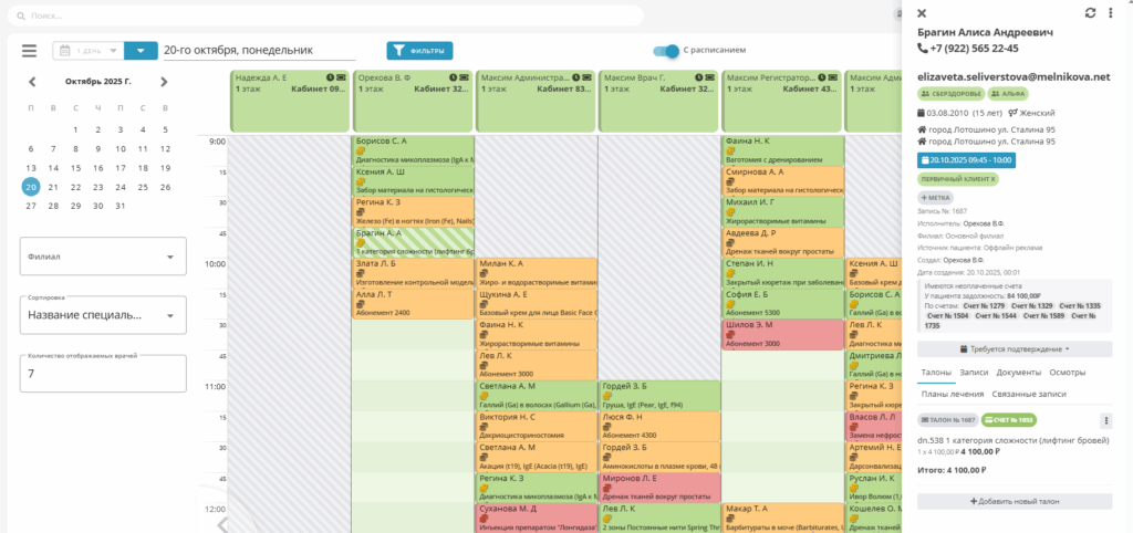 - Управление доходностью. Вы можете анализировать, какие врачи и услуги приносят наибольший доход, и корректировать расписание в соответствии с бизнес-задачами.